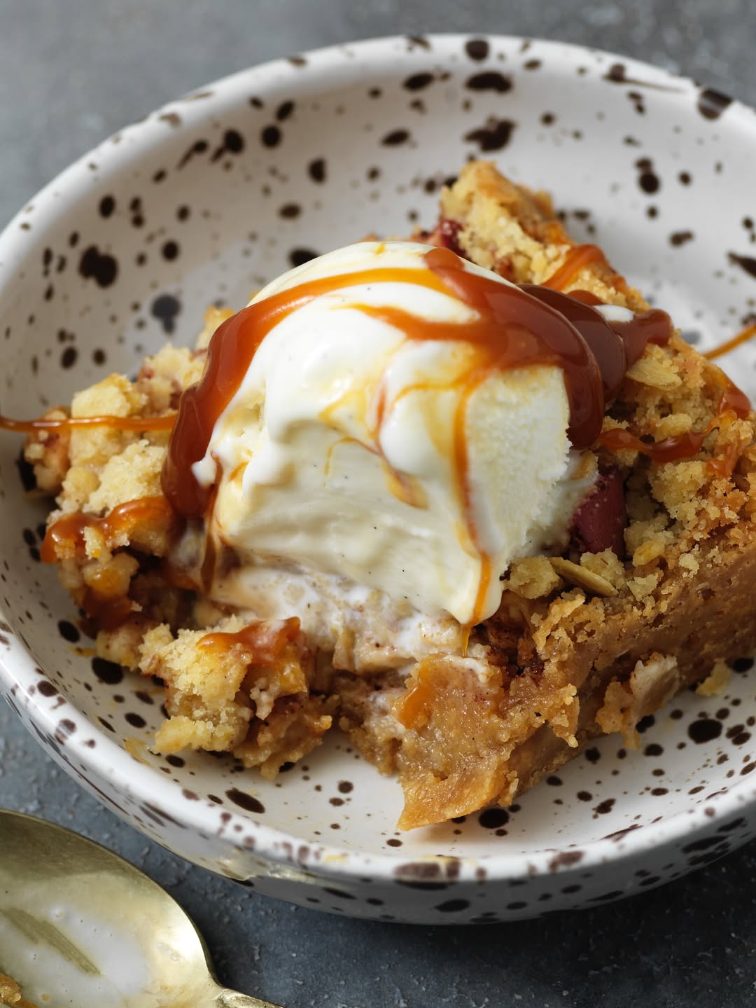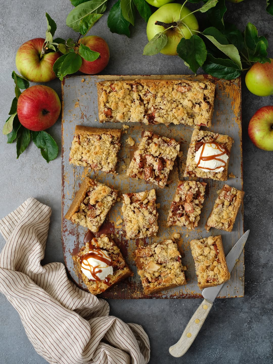 8. När blondien har gräddat klart, tar du ut den och toppar den med äpplena och pajsmulet. Ställ tillbaka formen i ugnen och grädda i ytterligare ca 20 minuter.