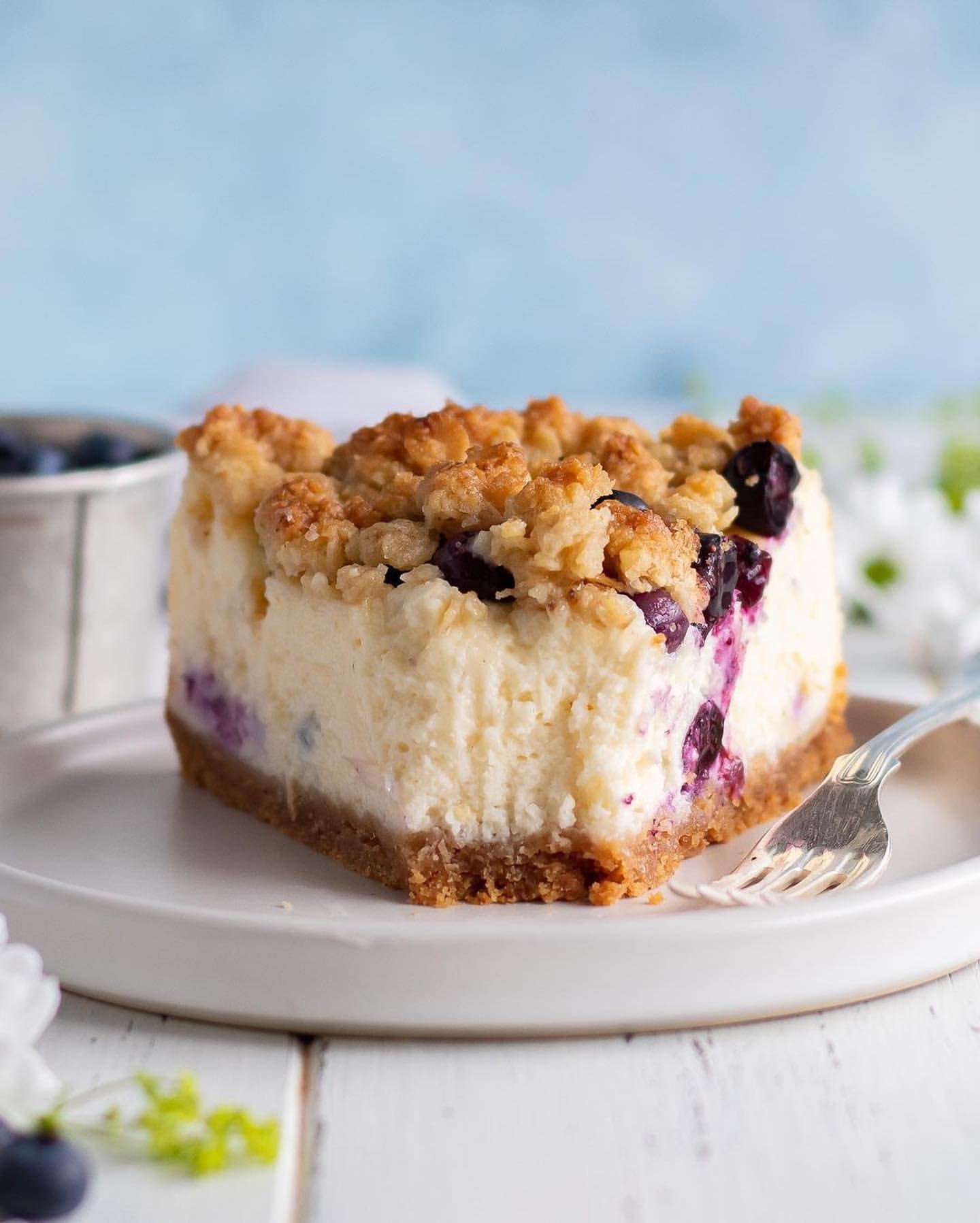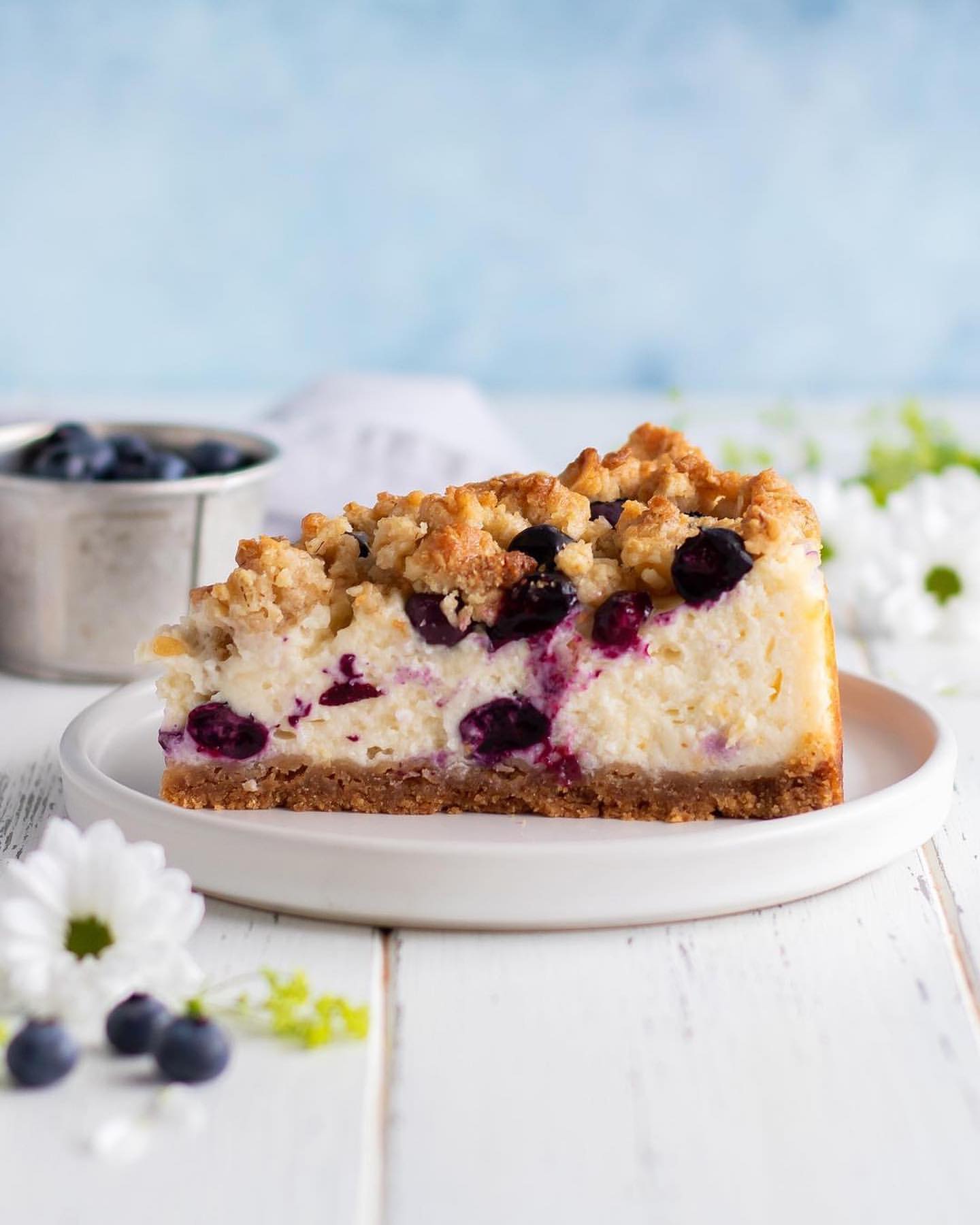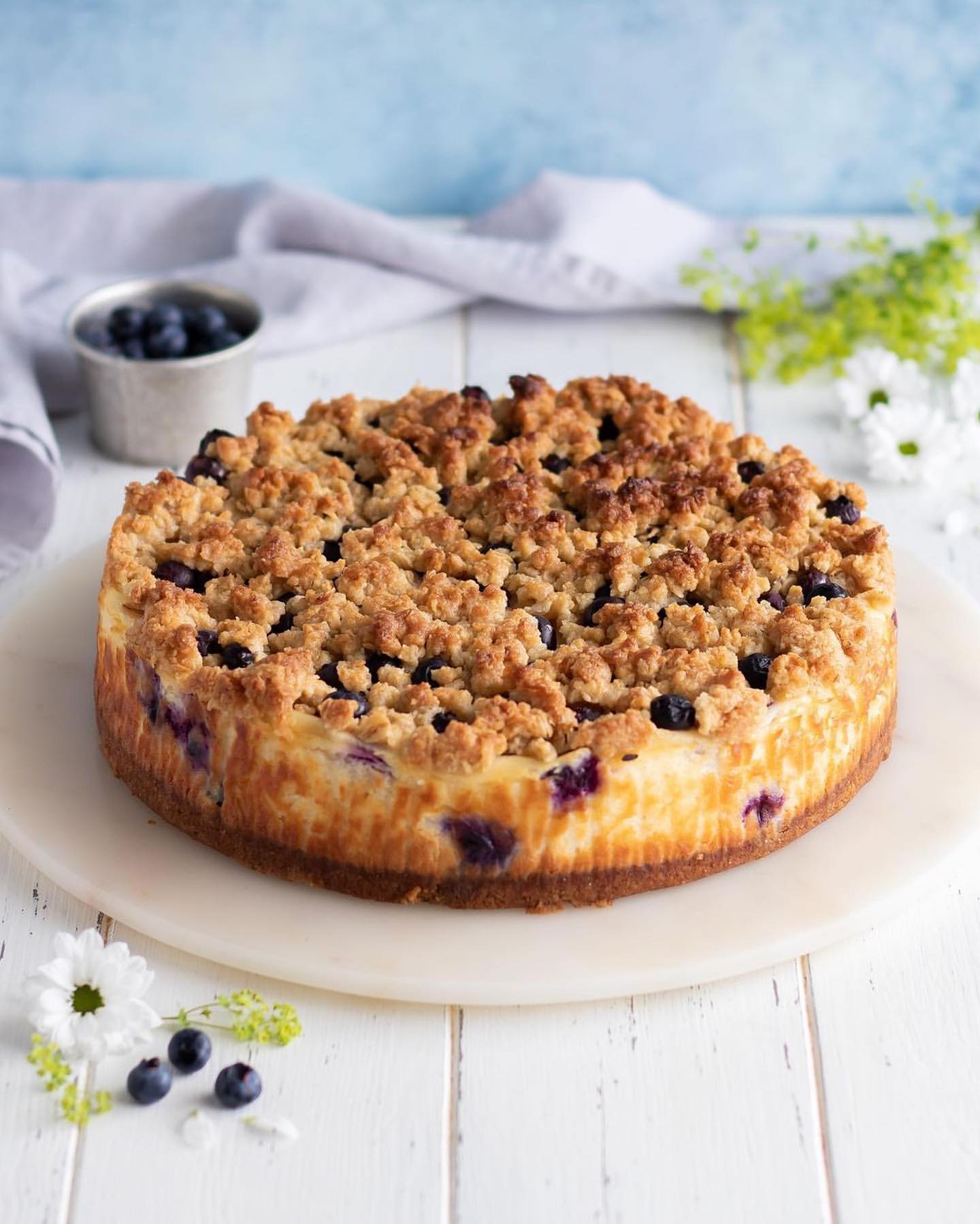 En krämig och god bakad blåbärscheesecake inspirerad av blåbärspaj – en blåbärspajcheesecake, helt enkelt!
