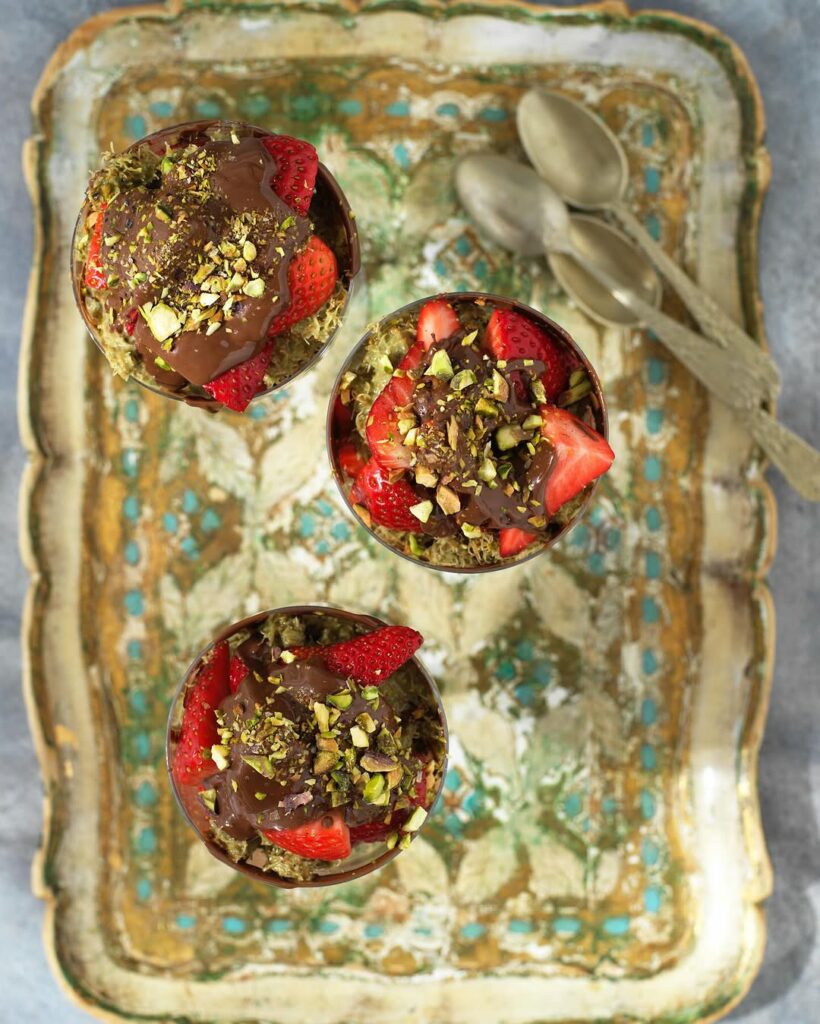 Den gyllenbruna kadayifen rostas i smör tills den blir härligt frasig och blandas sedan med pistagekräm för en djup och nötig smak. Den smälta mjölkchokladen binder ihop alla smaker, medan de färska jordgubbarna ger en frisk och fruktig kontrast. Slutligen toppas allt med finhackade pistagenötter för extra crunch och en vacker finish.