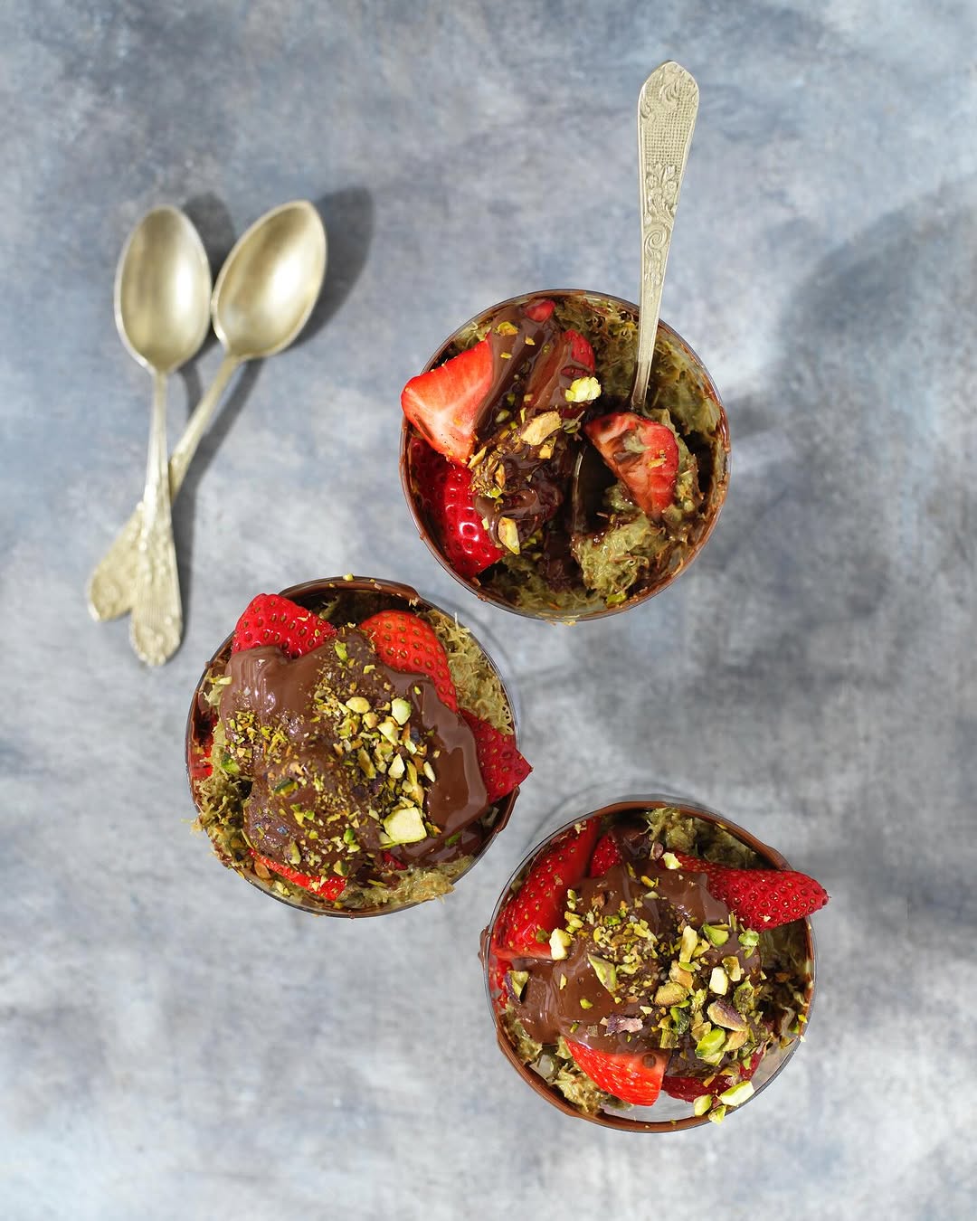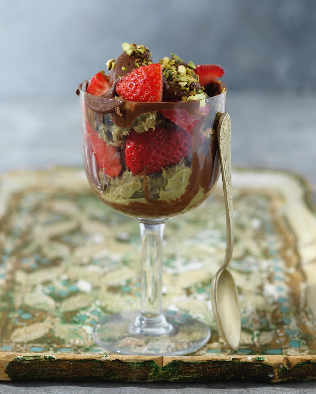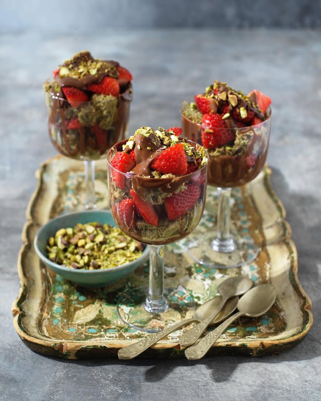 Den gyllenbruna kadayifen rostas i smör tills den blir härligt frasig och blandas sedan med pistagekräm för en djup och nötig smak. Den smälta mjölkchokladen binder ihop alla smaker, medan de färska jordgubbarna ger en frisk och fruktig kontrast. Slutligen toppas allt med finhackade pistagenötter för extra crunch och en vacker finish.