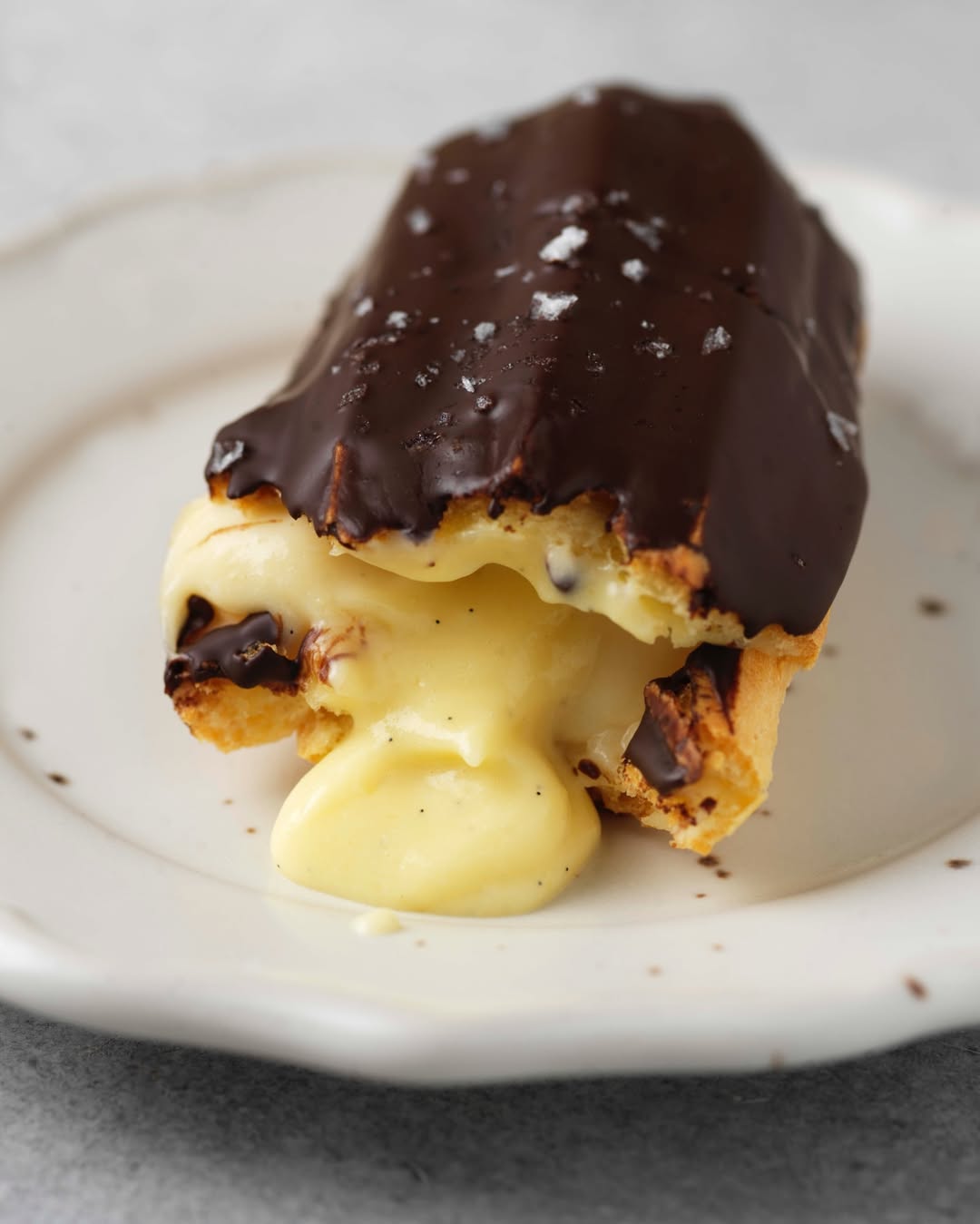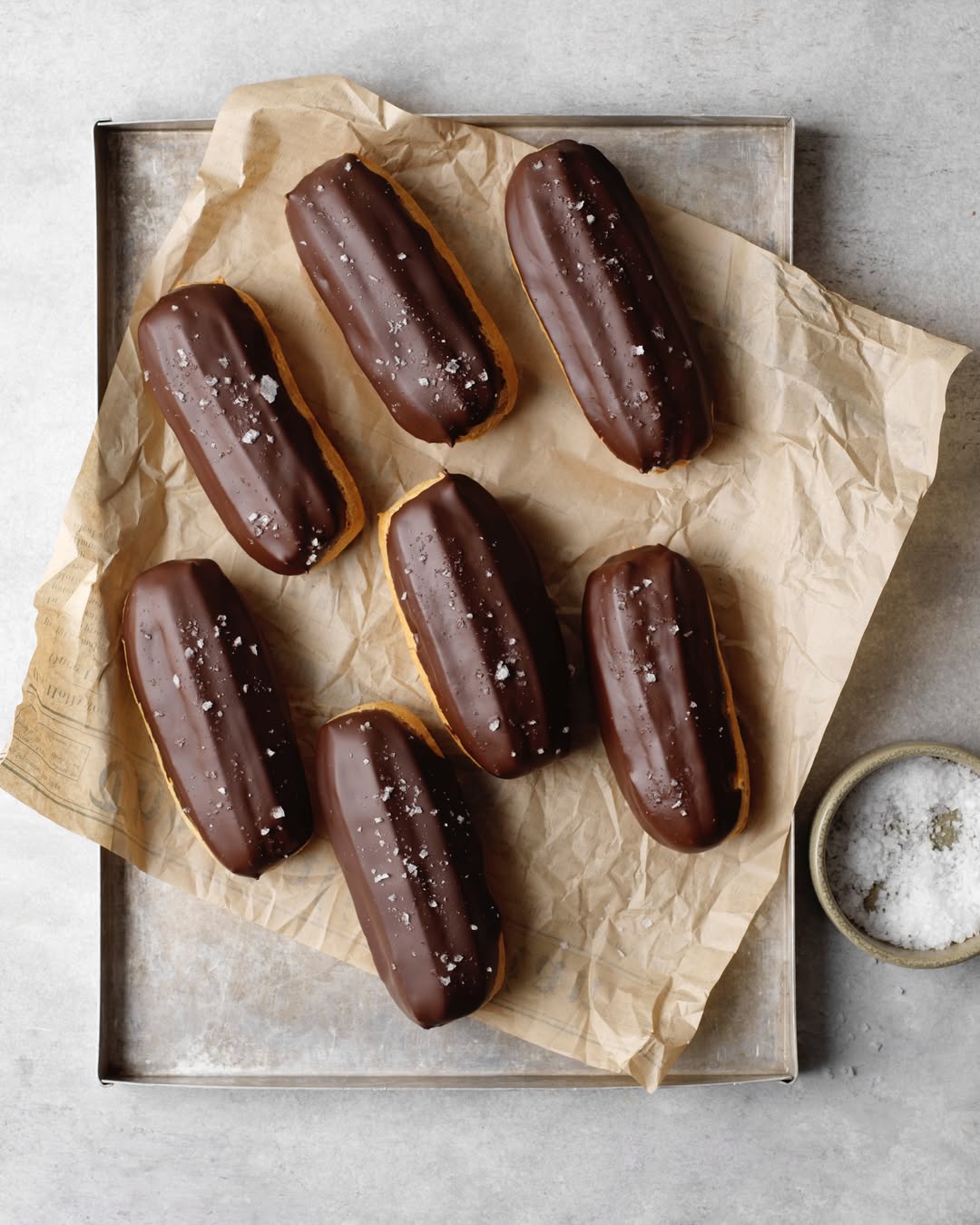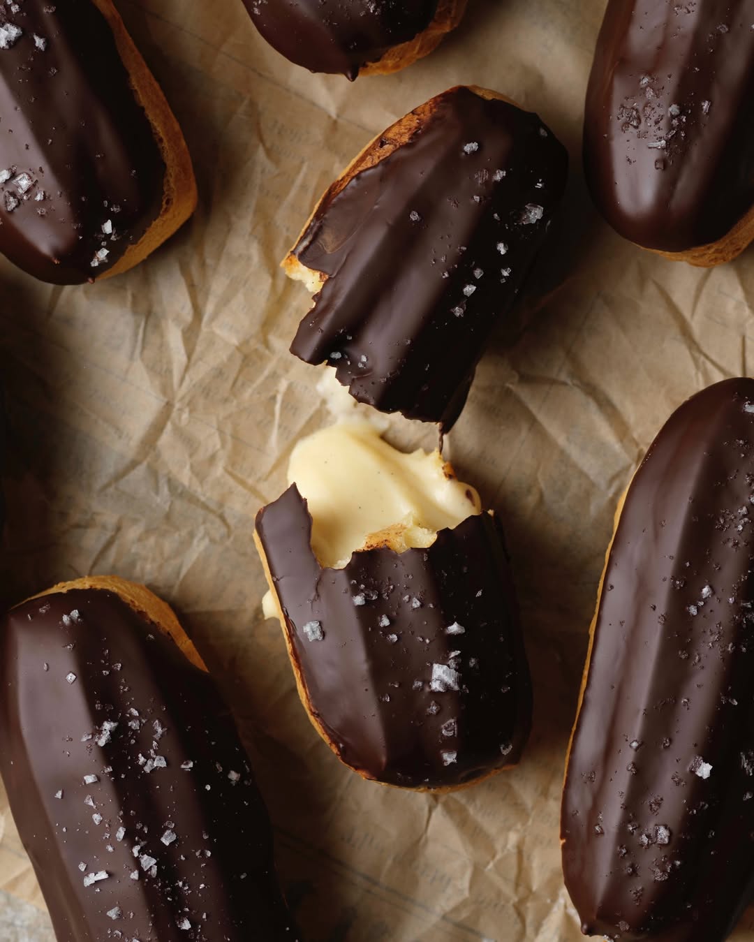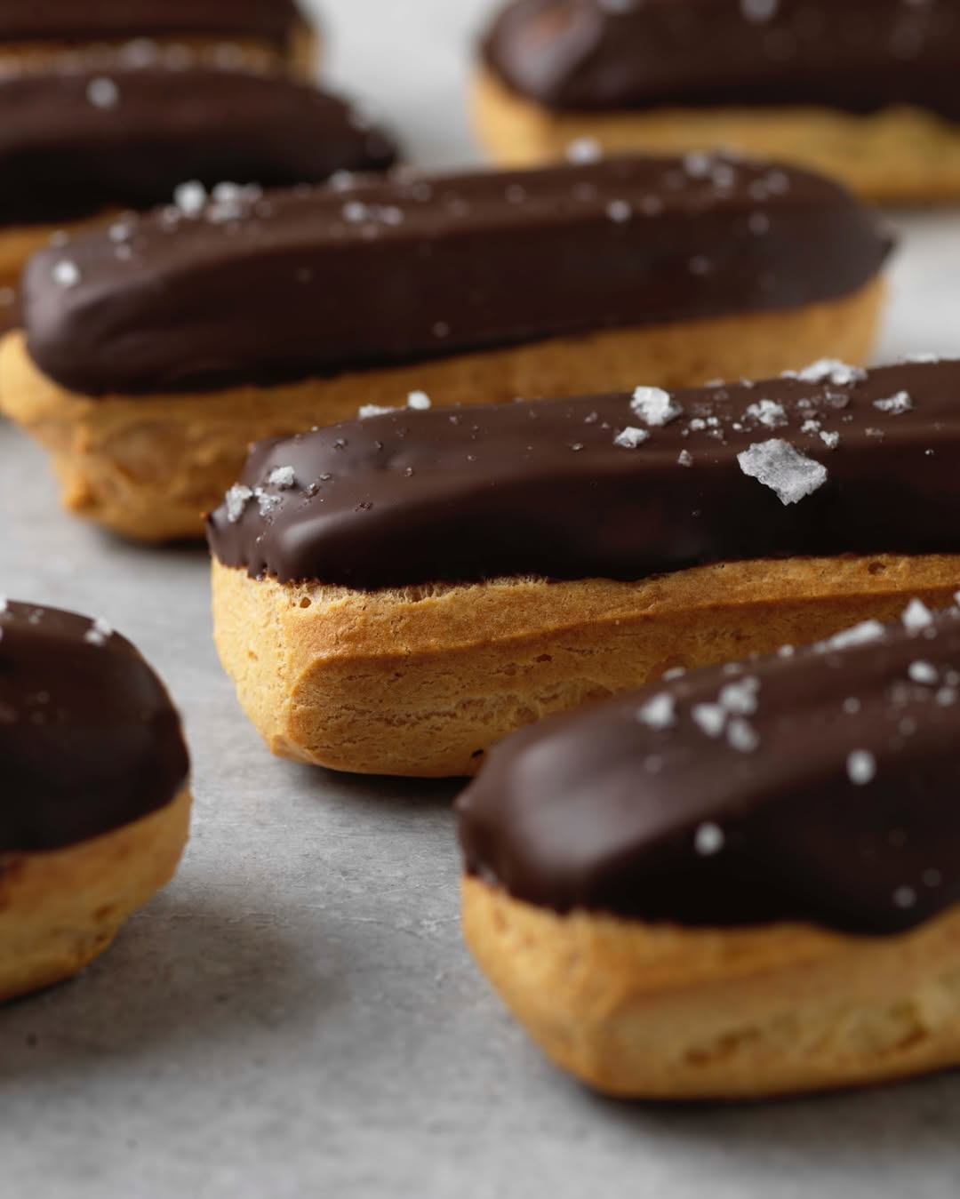 När jag var i Paris åt jag helt magiska éclairer, och jag visste direkt att jag måste hem och baka mina egna. Resultatet blev de här klassiska franska éclairerna med krispig yta, fyllda med len, hemgjord vaniljkräm och doppade i blank mörk choklad 😍 Ett riktigt drömbakverk där flingsaltet på toppen bryter av helt perfekt och gör varje tugga oemotståndlig. Vill du se min vlog från Paris? Klicka här för att se den på min YouTube-kanal!
