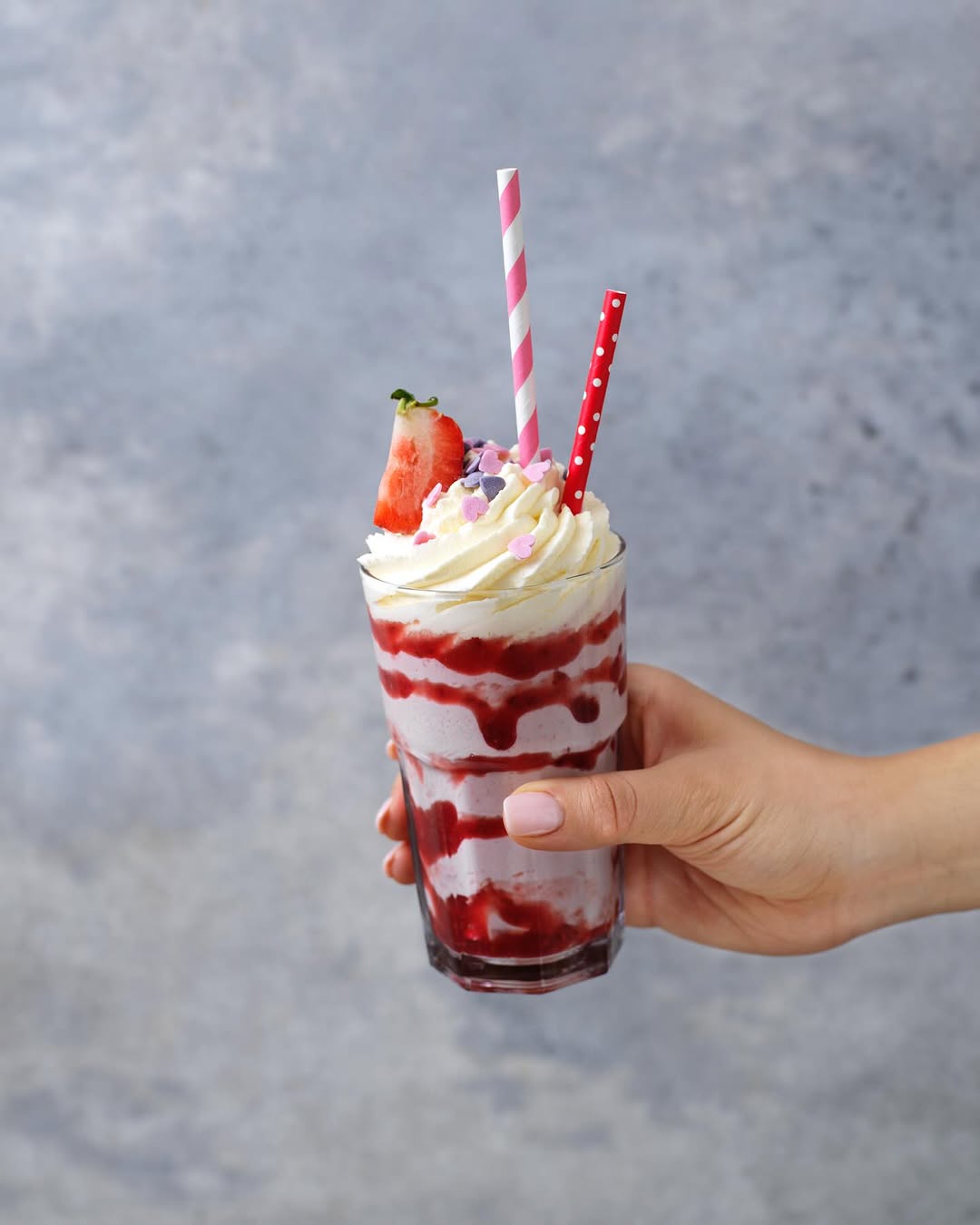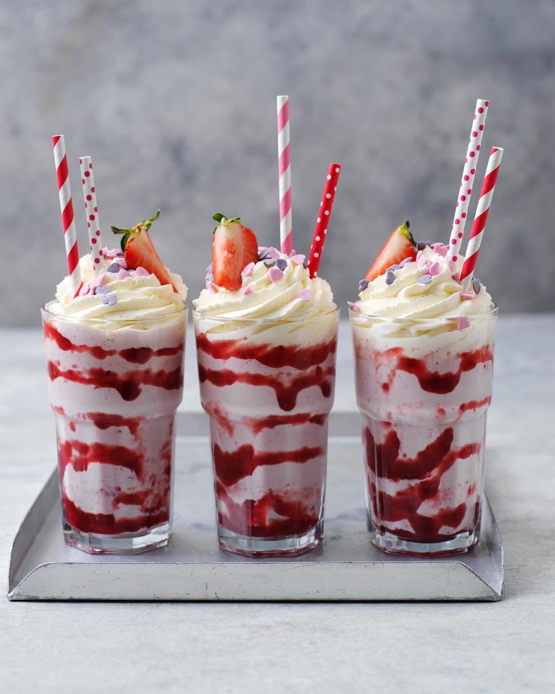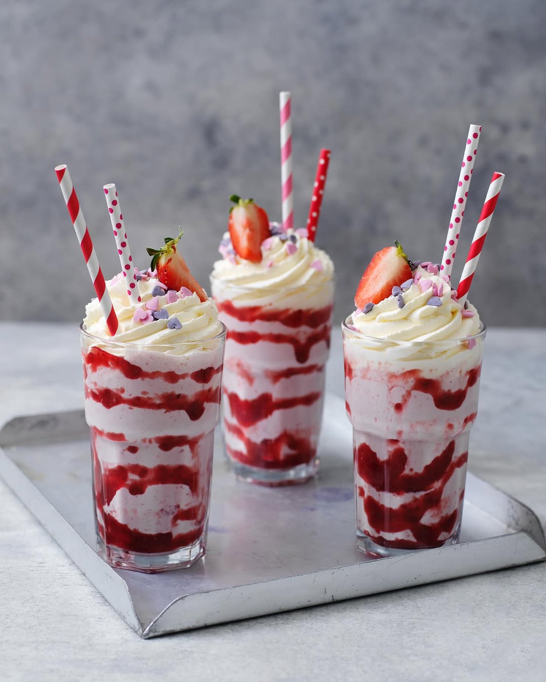 Denna ljuvliga jordgubbsmilkshake gjorde jag på Alla hjärtans dag, men är lika härlig att avnjuta en varm sommardag! Kombinationen av färska jordgubbar, vaniljglass och yoghurt ger en perfekt balans mellan sötma och friskhet, samtidigt som konsistensen blir krämigt len. För en extra lyxig känsla toppas milkshaken med fluffig vispgrädde, jordgubbssylt och strössel – en riktig njutning för både ögat och smaklökarna.