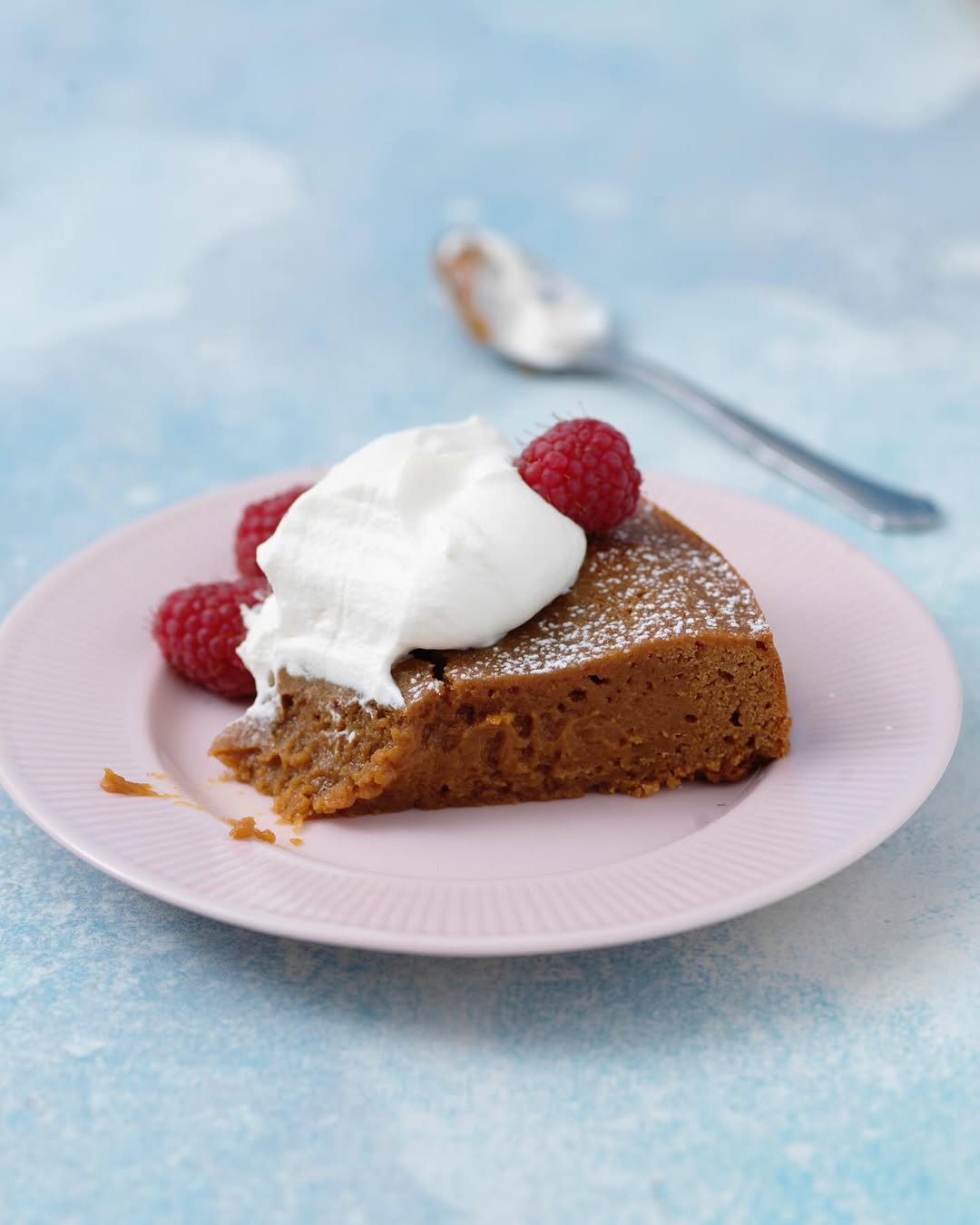 – Kakan ska vara fast i kanterna men dallrig i mitten när du tar ut den. Överbaka inte! Den sätter sig när den svalnar.
