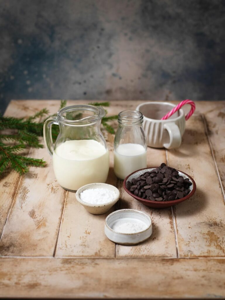 2. Grovhacka den mörka chokladen och rör ner den i den varma gräddmjölken. Rör om tills chokladen har smält.