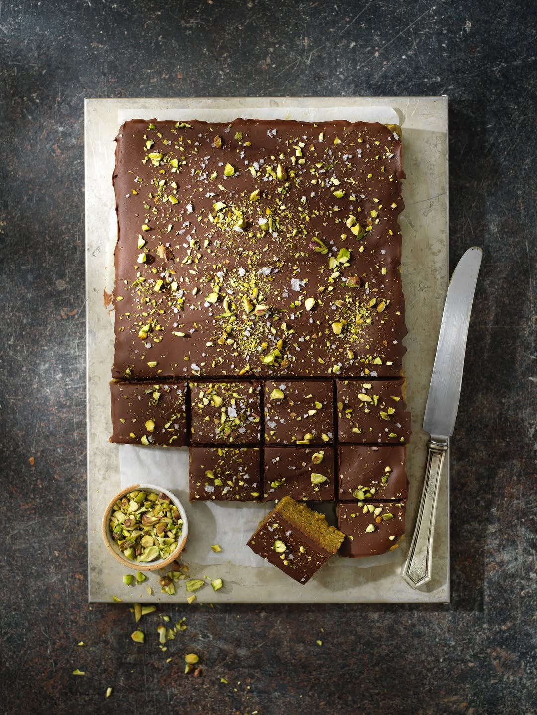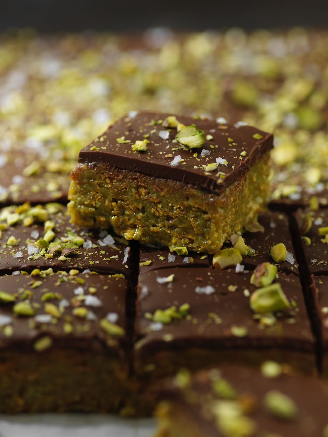 - Ta ut kakan från kylen och toppa med smält choklad, hackade pistagenötter och flingsalt. Hoppas att det ska smaka!