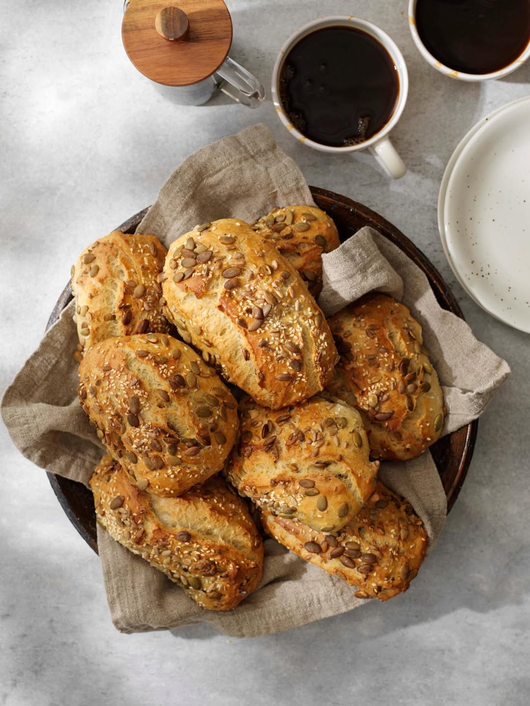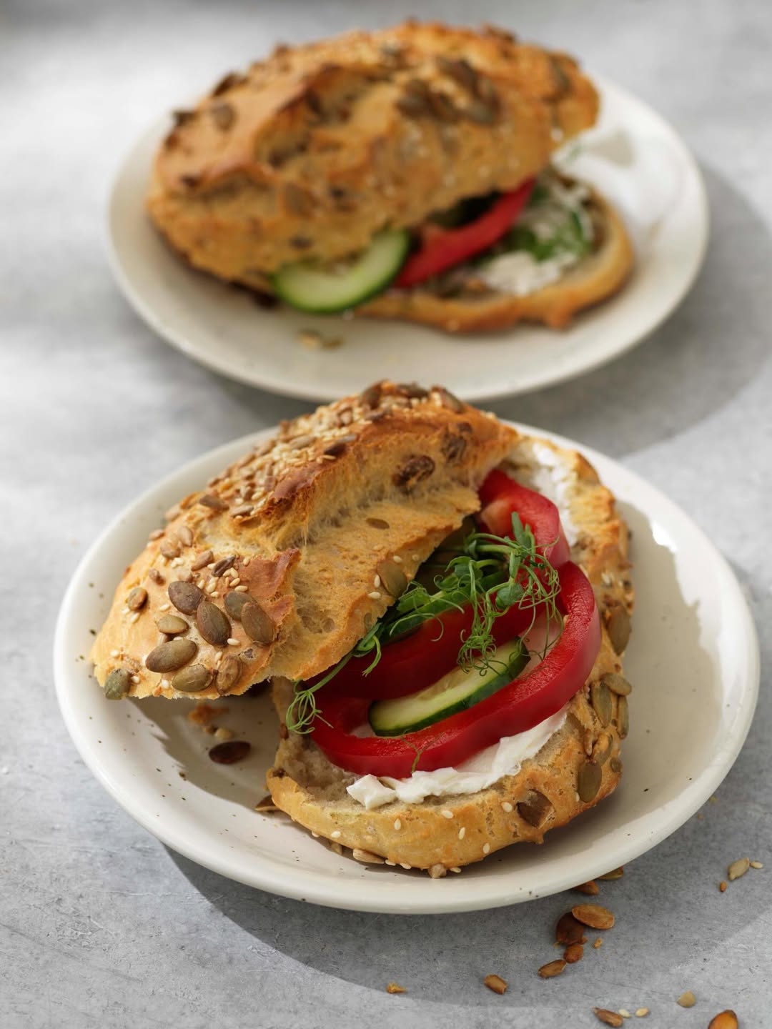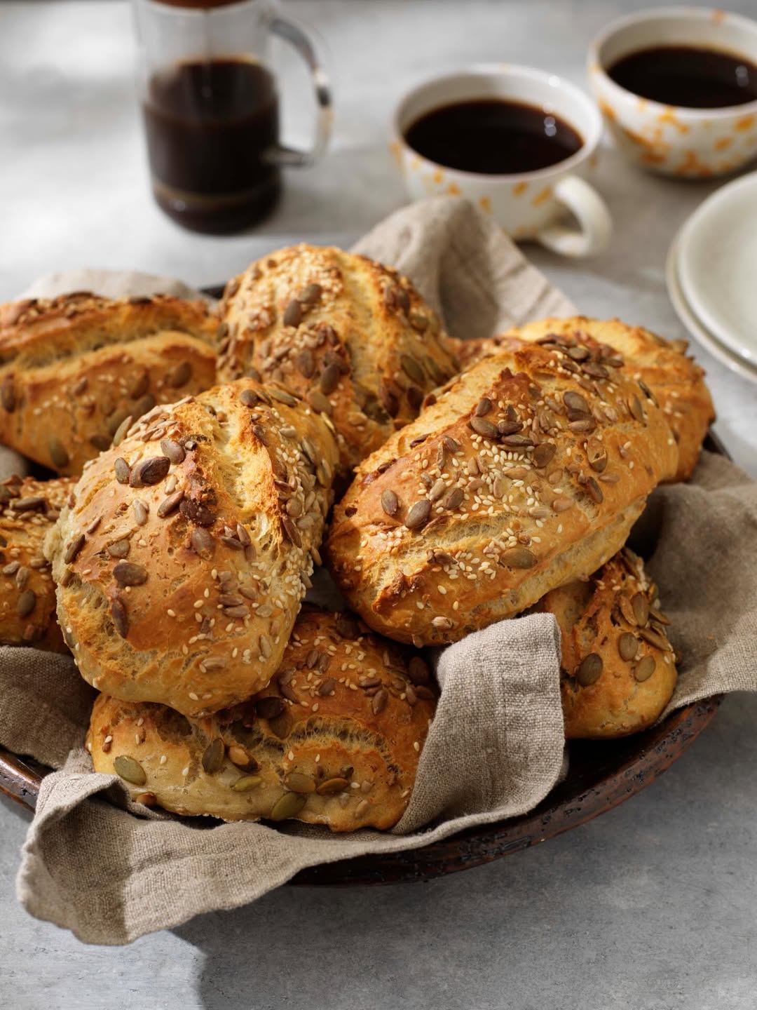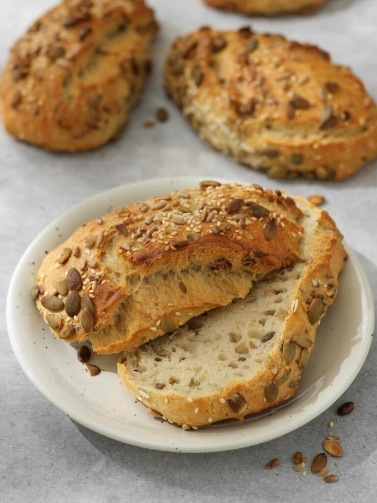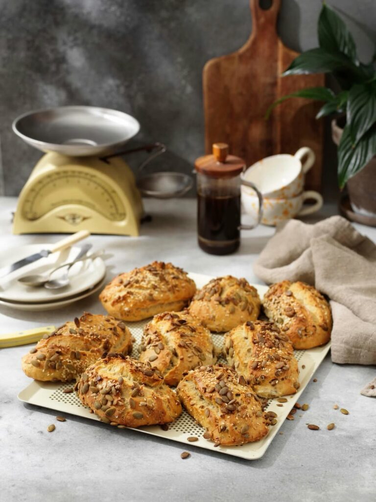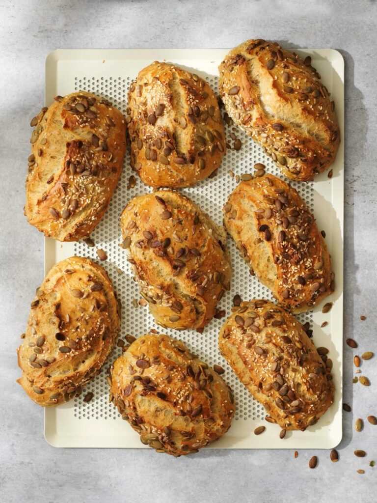 8. Dela upp degen i slarviga frallor och lägg upp dem på bakplåtar med bakplåtspapper och toppa med frön.