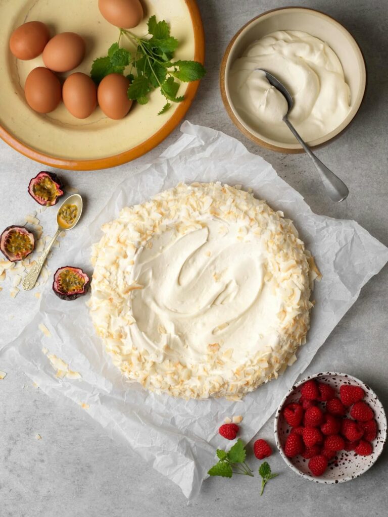 5. Täck kanterna av marängen med rostade kokosflakes och grädda den i mitten av ugnen i en och en halv timme.