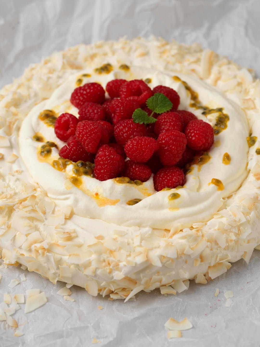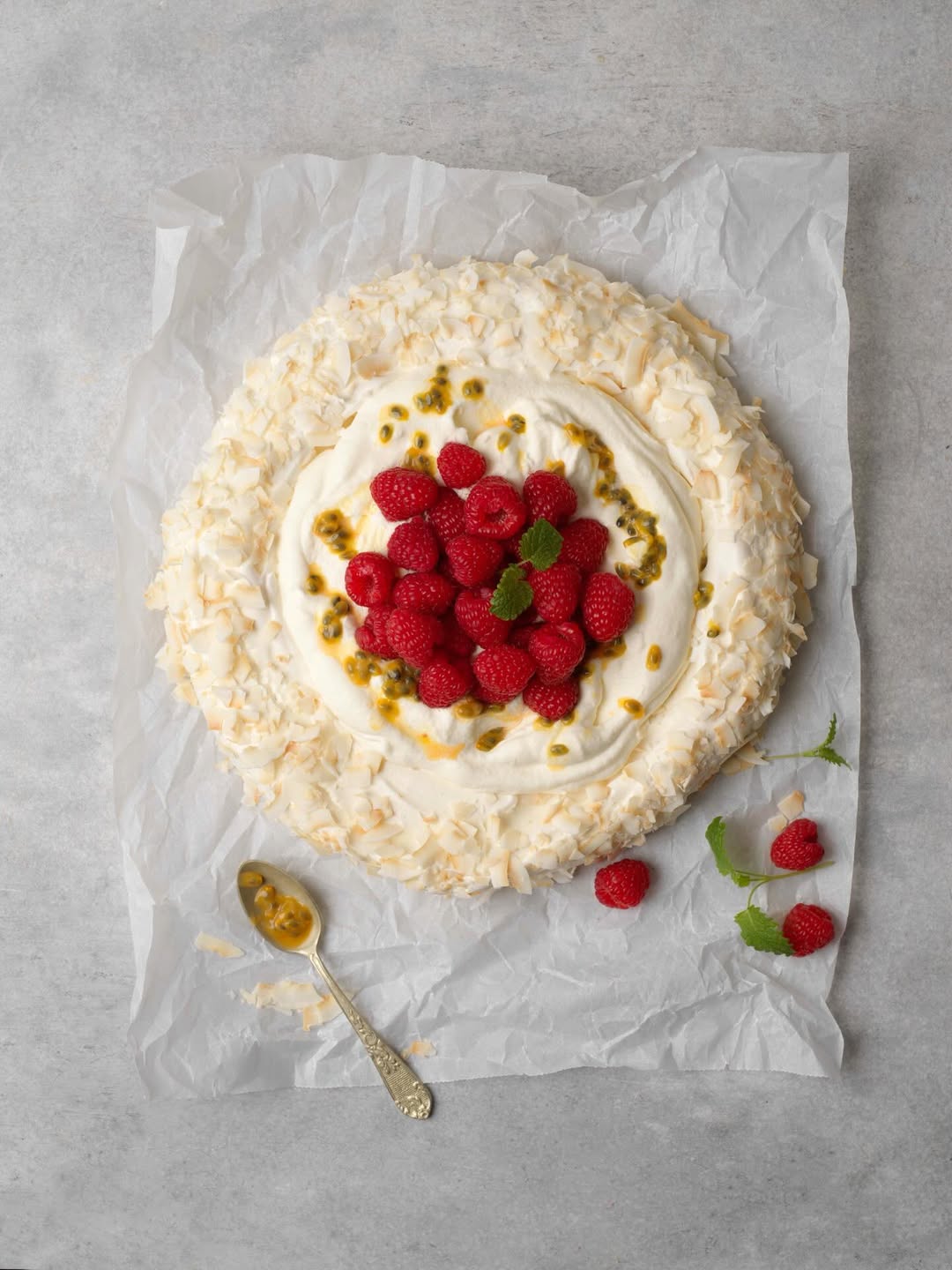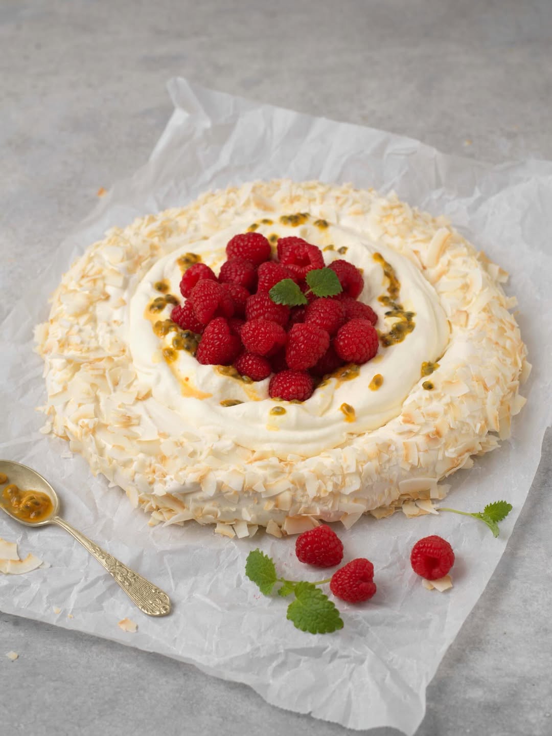 8. Toppa pavlovan med vispgrädde, halvera och gröp ur passionsfrukterna och toppa grädden med det samt färska hallon och citronmeliss. Hoppas att det ska smaka!