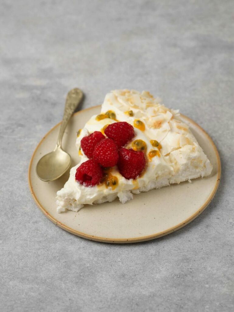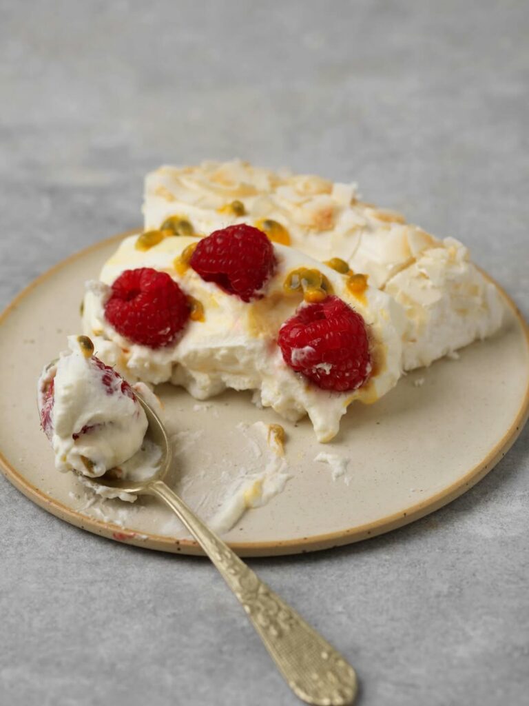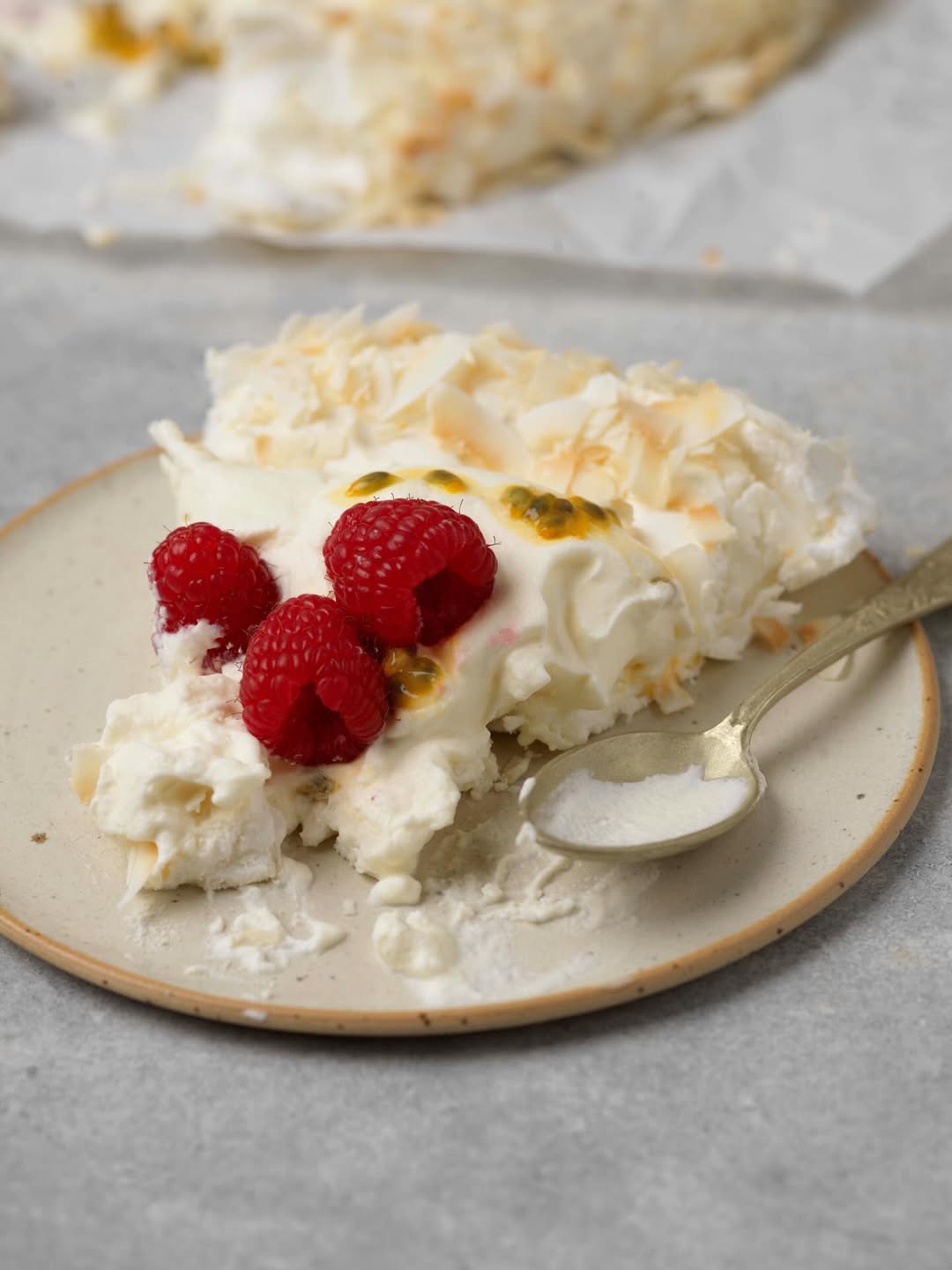 8. Toppa pavlovan med vispgrädde, halvera och gröp ur passionsfrukterna och toppa grädden med det samt färska hallon och citronmeliss. Hoppas att det ska smaka!