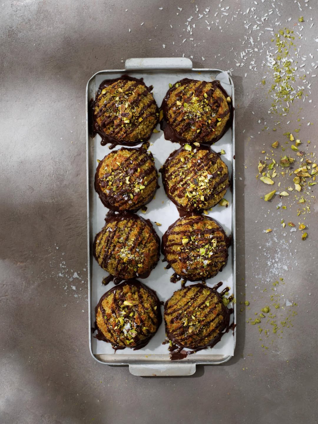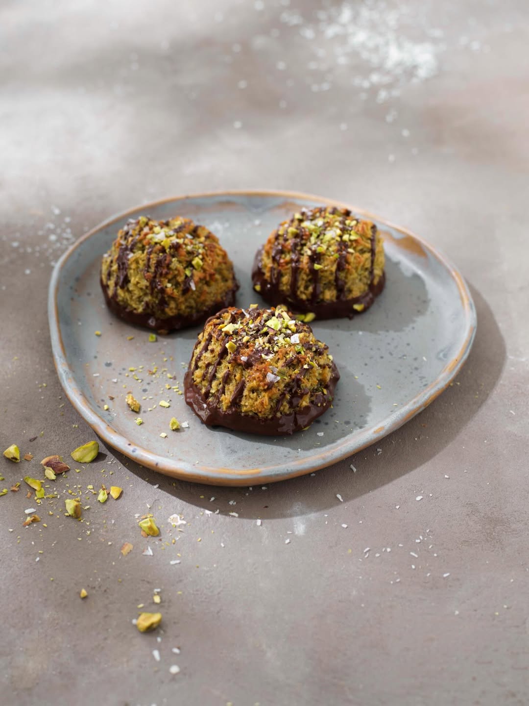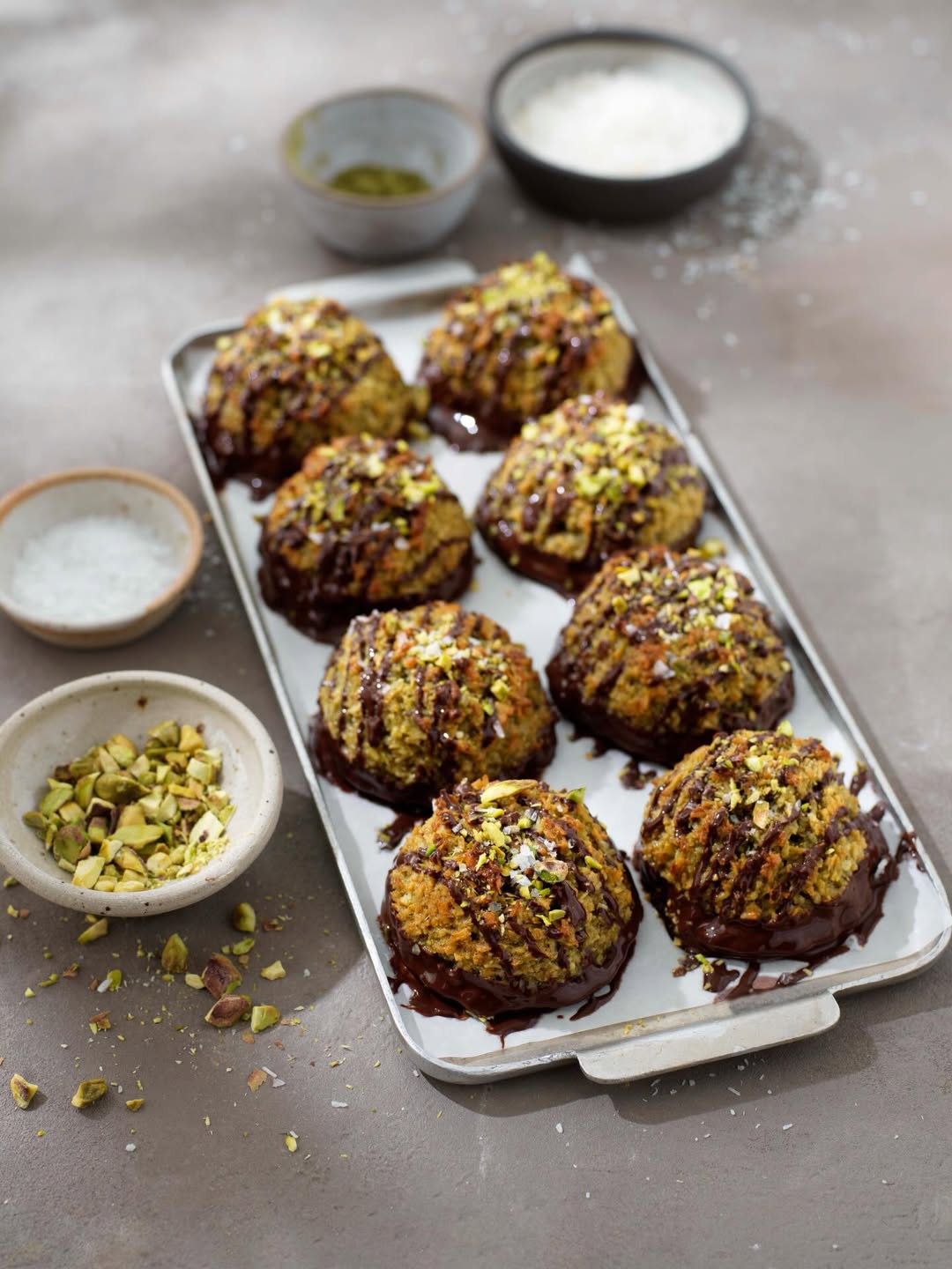 10. Dekorera topparna med den överblivna smälta chokladen genom att spritsa eller ringla över fint, toppa med pistagenötter och flingsalt. Hoppas att det ska smaka!